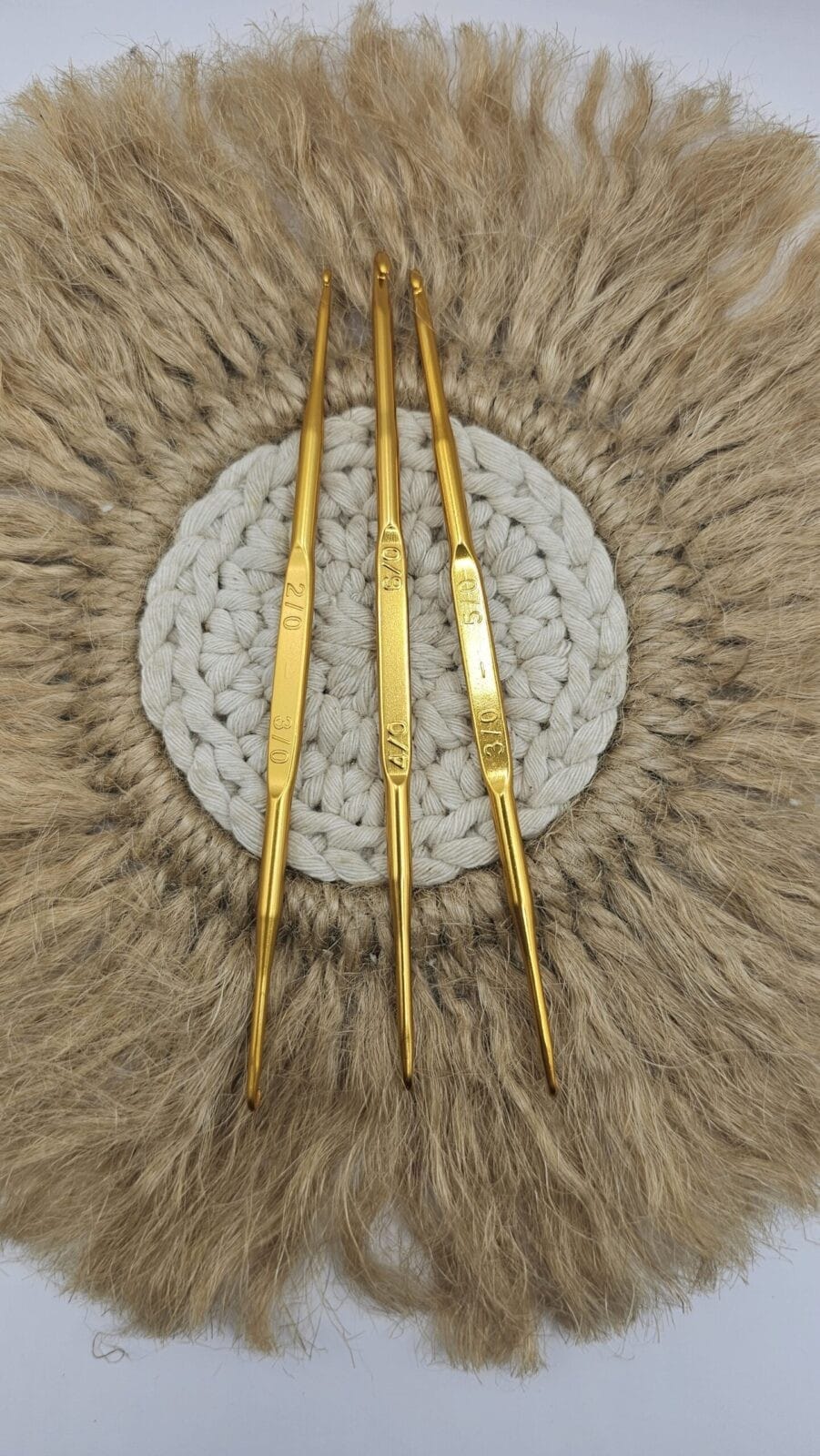 Descripción: Aguja crochet doble punta de aluminio dorado. Una aguja de crochet de aluminio es una herramienta esencial para los amantes del tejido. Recuerda que la elección de la aguja dependerá del grosor del hilo y del tipo de proyecto que estés realizando. ¡Disfruta de tus creaciones tejidas! 🧶