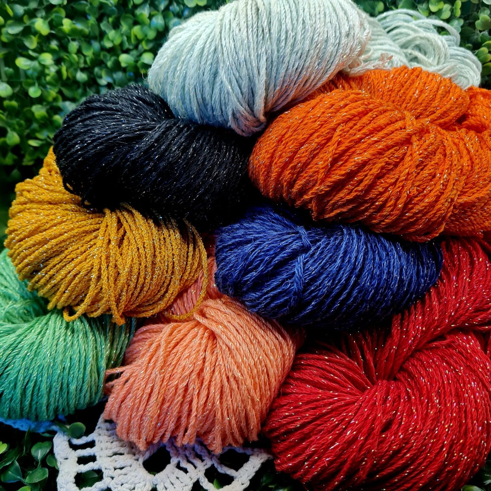 Descripción: Es un hilado de algodón con una hebra de lurex que le da un brillo especial, para tejidos manuales. Materia prima 100% natural.  Hilado ideal para prendas de primavera verano, artesanías, manualidades, souvenirs, regalos, etc.