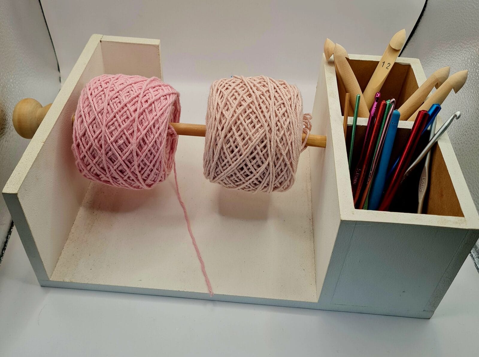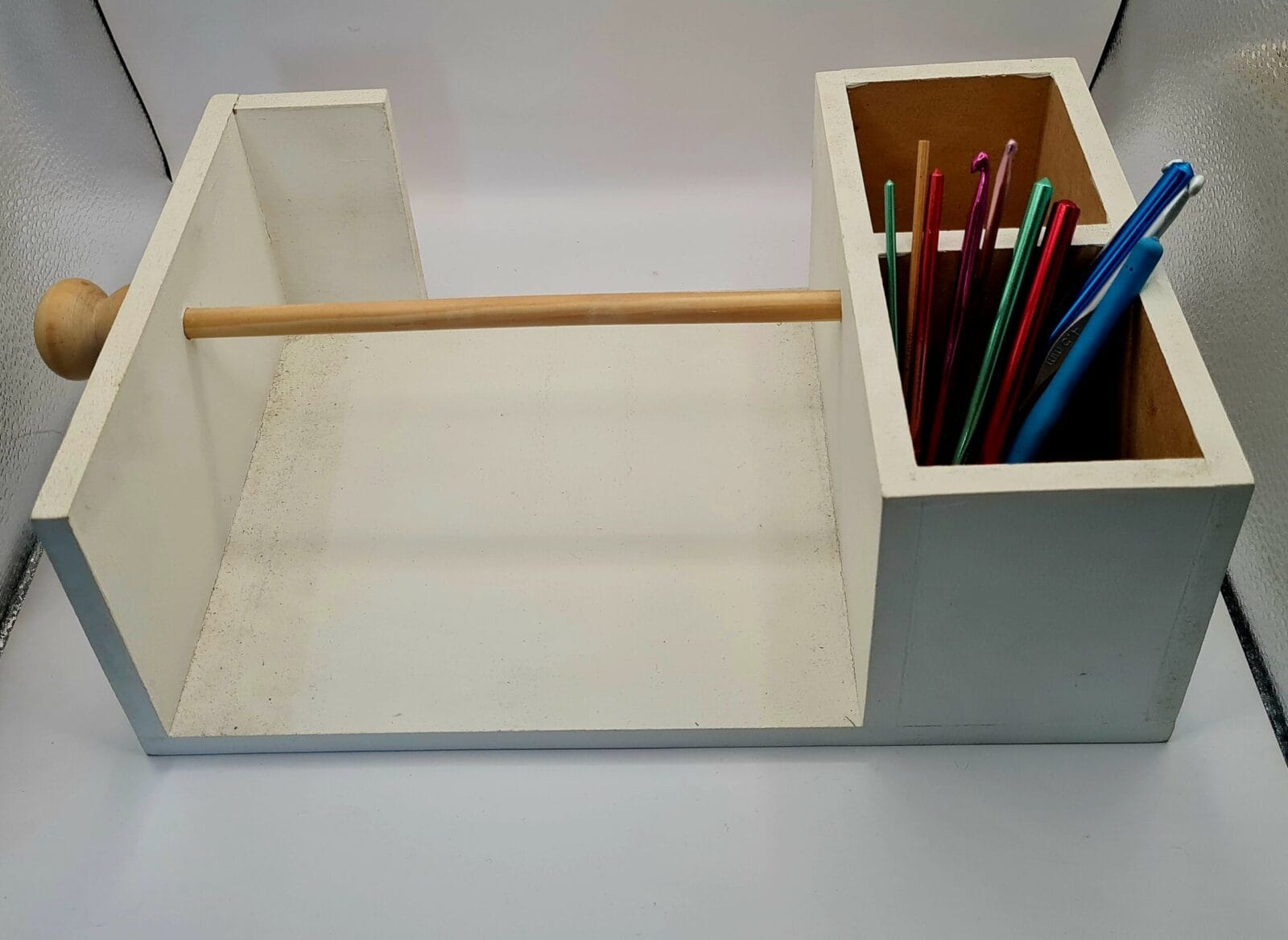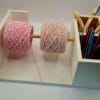 Descripción: Porta ovillos de lana giratorio en forma horizontal con compartimientos para mas guardados. viene sin pintar